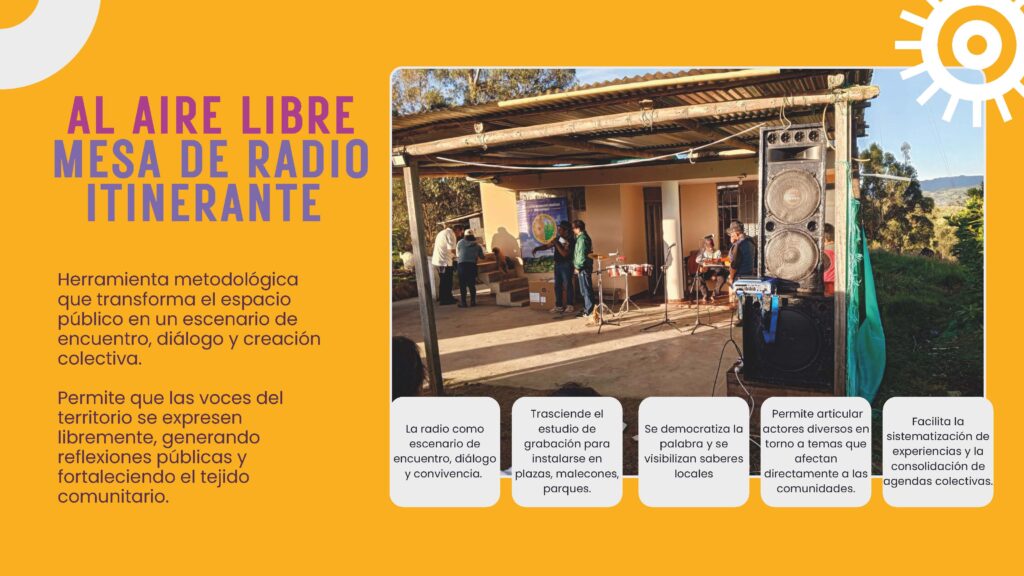 Una línea de acción clave para la estrategia es AL AIRE Libre, una mesa de radio itinerante que traslada la producción sonora al espacio público. Esta herramienta convierte plazas, parques y escenarios comunitarios en lugares de conversación abierta, donde la palabra se democratiza, se visibilizan saberes locales y se articulan actores diversos en torno a asuntos que afectan directamente a las comunidades. AL AIRE Libre no solo produce contenidos: activa encuentros, propicias reflexiones públicas y contribuye a la construcción de agendas colectivas.